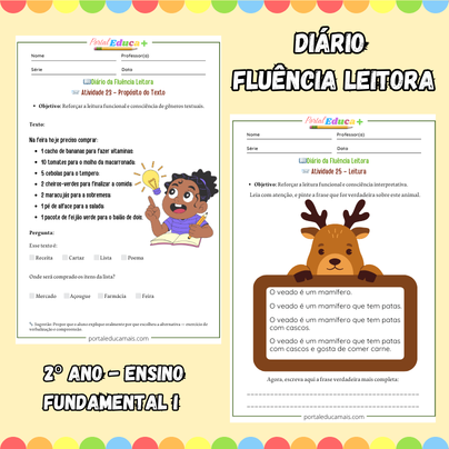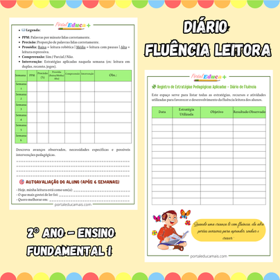 - O material contém ainda, explicações sobre: os Fundamentos da Fluência Leitora; Fluência Leitora na BNCC; Instruções de aplicação das Atividades e dos Testes; Sugestões Importantes para o desenvolvimento da fluência da turma; Fichas de Acompanhamento Semanal; Registro de Estratégias Pedagógicas Aplicadas – Diário de Fluência; Caderno de Atividade; Jogos de leitura.